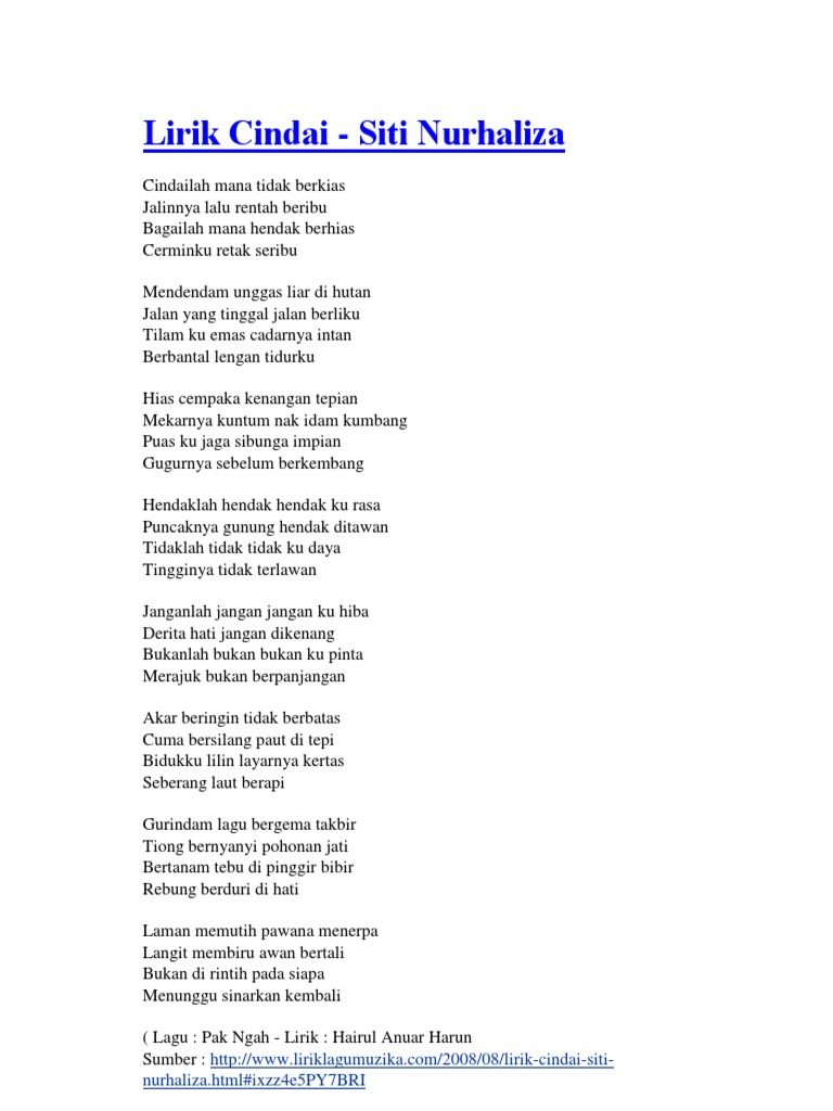 Lirik Lagu Siti Nurhaliza - Cindai Lirik Lagu Siti Nurhaliza - Cindai. Puncaknya gunung hendak ditawan. Nah Bunda tak perlu bingung mencari rangkuman seputar lagu-lagu nasional.